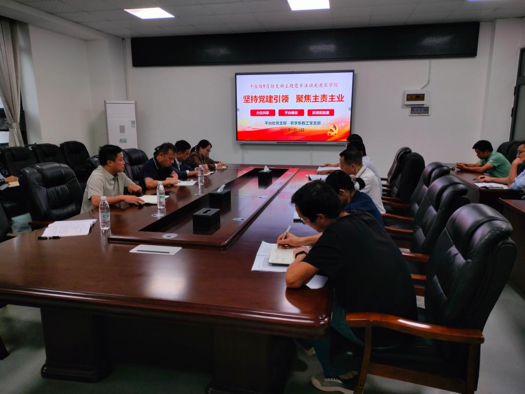 (通讯员 陈爱霞)9月18日下午,平台处党支部走进农学院,与农学系教工党支部联合开展9月份支部主题党日活动,政治理论学习环节由农学系教工党支部书记邱先进主持,业务交流环节由平台处党支部书记谭亮魁主持,农学院党委书记周锦华参加活动并讲话。